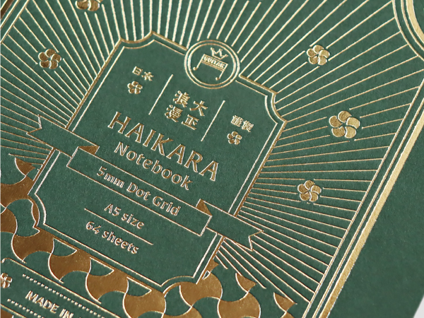 大正時代の情緒をまとうレトロモダンなデザインに金箔印刷をあしらい、高級感のある仕上がりに。書く時間をより特別なものにしてくれる、こだわりの詰まったノートです。