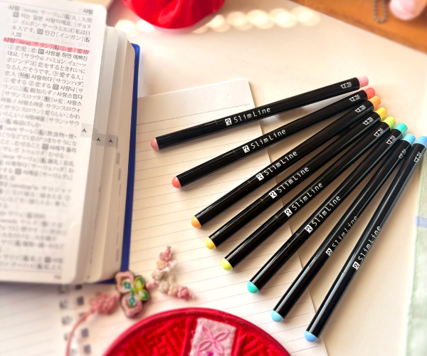 スリムな2.4mm幅ペン先で、小さい文字、細い罫線にも、細くきれいな線が引けます。裏移りの少ない水性顔料インキを採用。